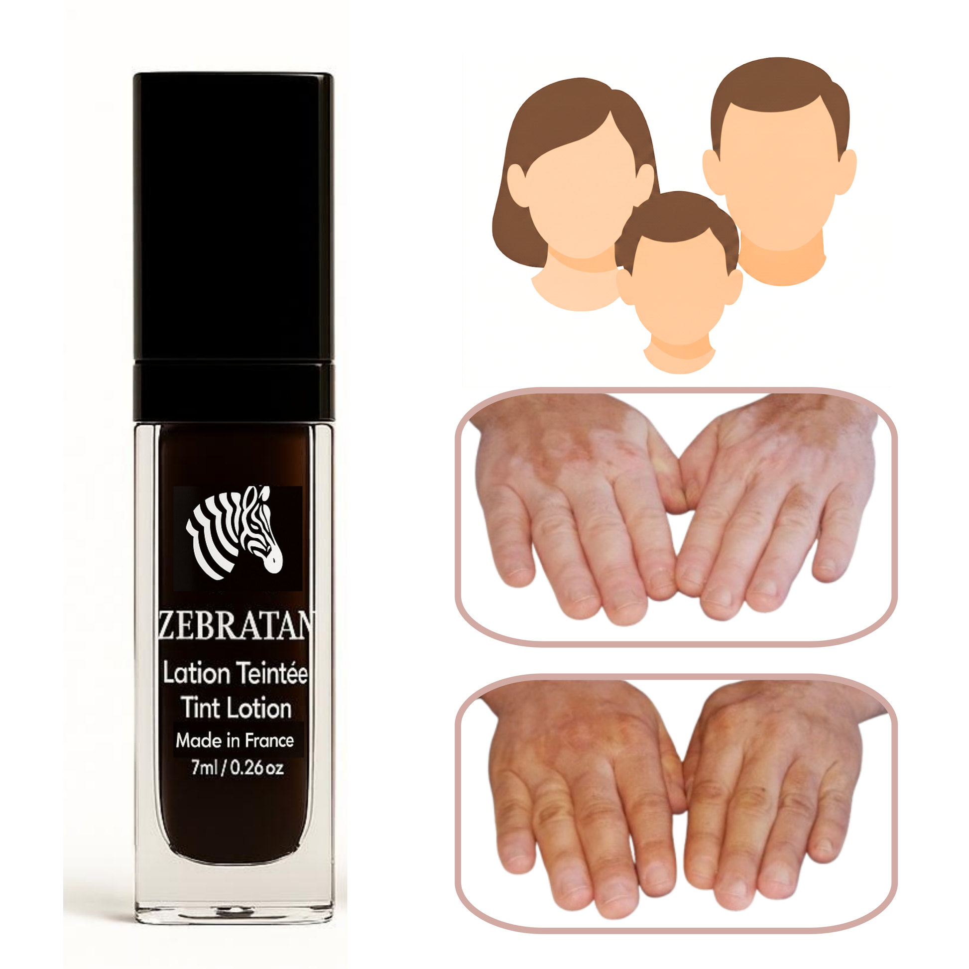 Zebratan est une lotion de maquillage spécialement conçue pour camoufler les zones de vitiligo. Sa formule progressive offre un rendu naturel, modulable et durable, pour un teint unifié qui respecte la couleur de votre peau. Cette lotion non grasse n'est pas comme un fond de teint, ainsi elle peut être utilisée par les hommes, les femmes, les enfants dès l'âge de 3 ans.